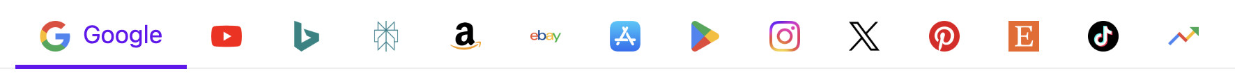 Keyword Suggestions service allows getting keyword suggestions from Google, YouTube, Bing, Perplexity, Amazon, eBay, App Store, Play Store, Instagram, Twitter, Pinterest, Etsy, TikTok, and Google Trends.